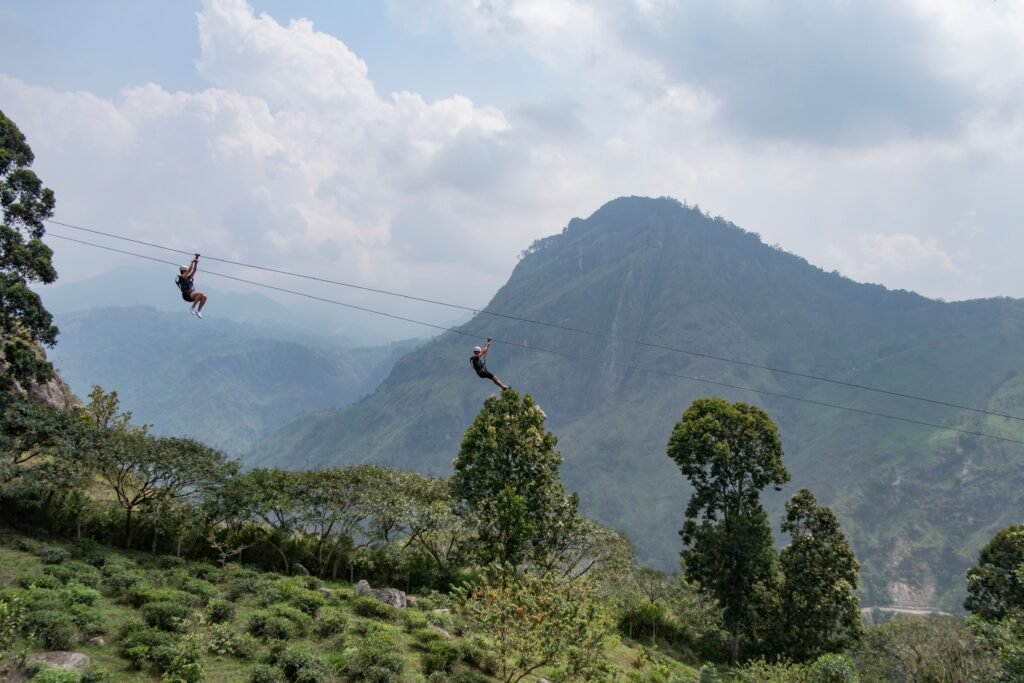 Soar over lush emerald tea fields and rolling valleys on Ella’s 500-meter dual zip-line. The thrill of the ride complements the breathtaking views of Little Adam’s Peak and the surrounding hills.